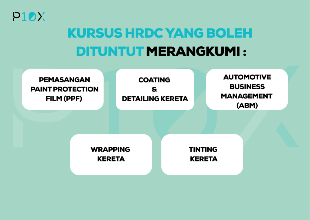 Contoh: Menghantar 5 pekerja untuk kursus pemasangan Paint Protection Film (PPF) di P10X Academy biasanya berharga RM8,000. Dengan HRDC, kos itu boleh dituntut balik—pekerja anda kembali dengan kemahiran baharu yang terus membuka peluang pendapatan baharu.